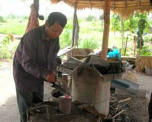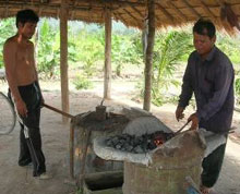 Khat Rim is now the supervisor of the team, and when one of the original members left, he trained the replacement. He and his team produce a range of machetes and axes for both village residents and people outside the village. They also re-sharpen old blades by re-heating and beating out a new edge. He would like to be able to produce a stock of goods for selling, but admits at the moment that that would be difficult. Part of the reason for this is that the whole team needs to work together to turn out new goods and they are not always available at the same time. Another problem is that they need extra capital so that they can purchase additional materials needed to make certain tools.